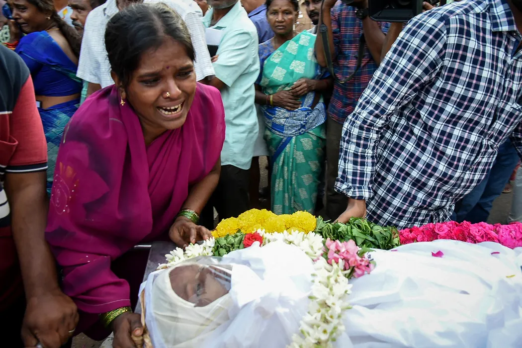 A relative mourns after receiving the dead body of a victim who was killed in a stampede that broke out during a campaign rally last evening in the Karur district, in the Indian state of Tamil Nadu, on September 28, 2025. At least 36 people were killed on September 27 after a stampede broke out at a campaign rally of popular actor-turned-politician Vijay in Tamil Nadu, the state's chief minister said.,Image: 1041250215, License: Rights-managed, Restrictions: Graphic Content, Model Release: no