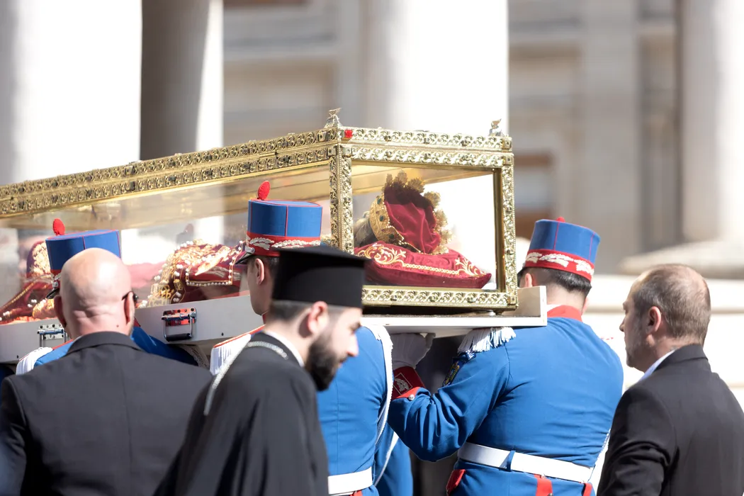 Credinciosi, preoti si maicute asteapta sa se inchine la Moastele intregi ale Sfintei Imparatese Elena, mama Sfantului Imparat Constantin cel Mare, aduse in pelerinaj de la Venetia, la Catedrala Patriarhala din Bucuresti, miercuri, 30 aprilie 2025. ALEXANDRA PANDREA/GMN