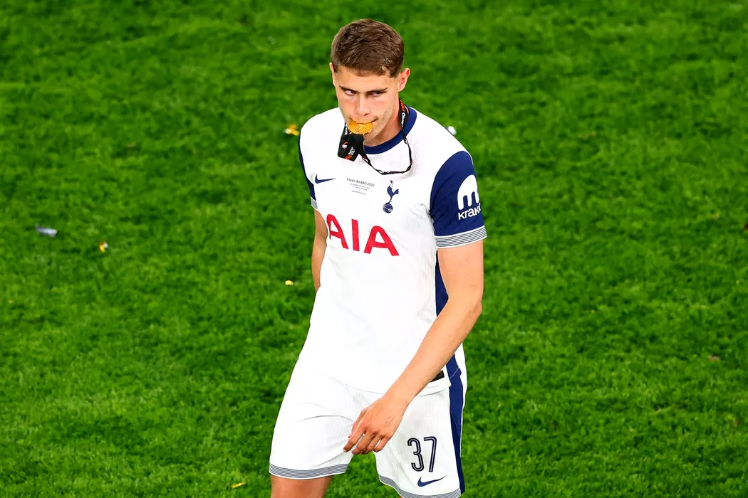 Micky van de Ven de la Tottenham Hotspur cu medalia câștigătorilor, după meciul Tottenham Hotspur - Manchester United, Finala Europa League