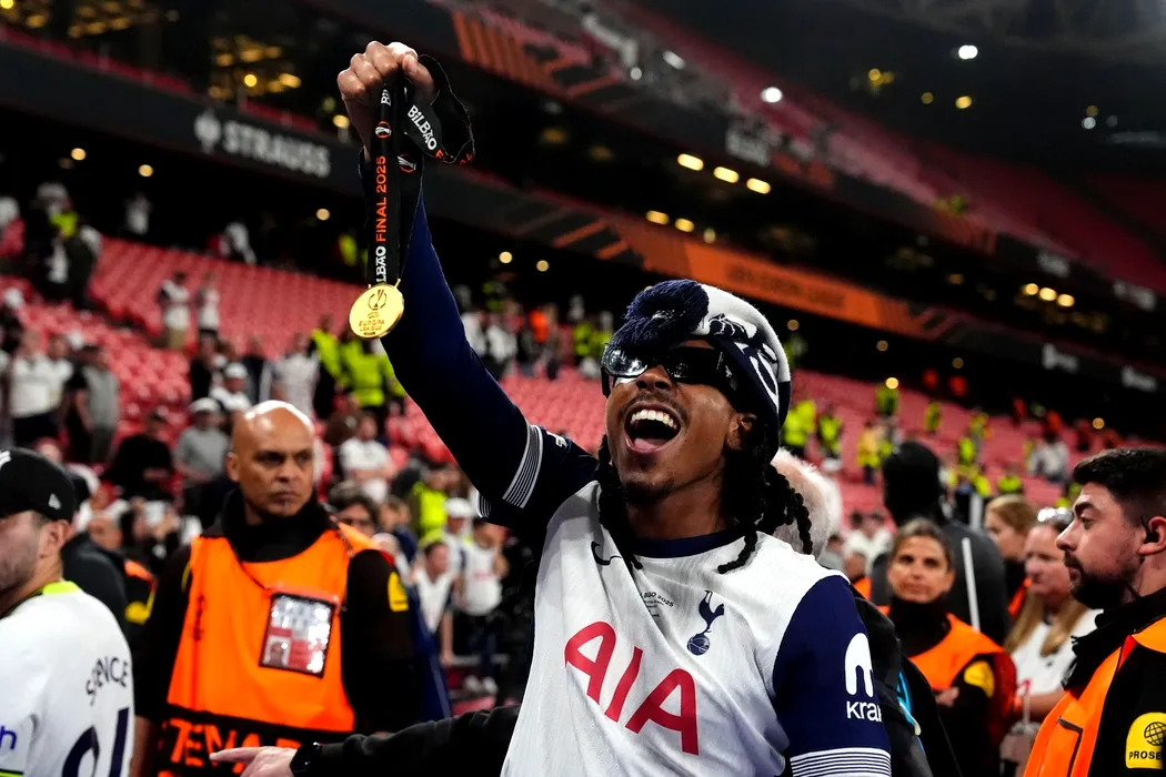 Djed Spence de la Tottenham Hotspur cu medalia de câștigător după victoria din finala UEFA Europa League de pe Estadio de San Mames din Bilbao, Spania.