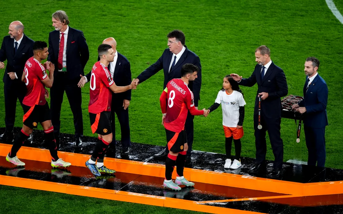 Bruno Fernandes de la Manchester United pare dezamăgit în timp ce își ridică medalia de finalist de la președintele UEFA, Aleksander Ceferin, după finala UEFA Europa League de pe Estadio de San Mames, Bilbao, Spania.