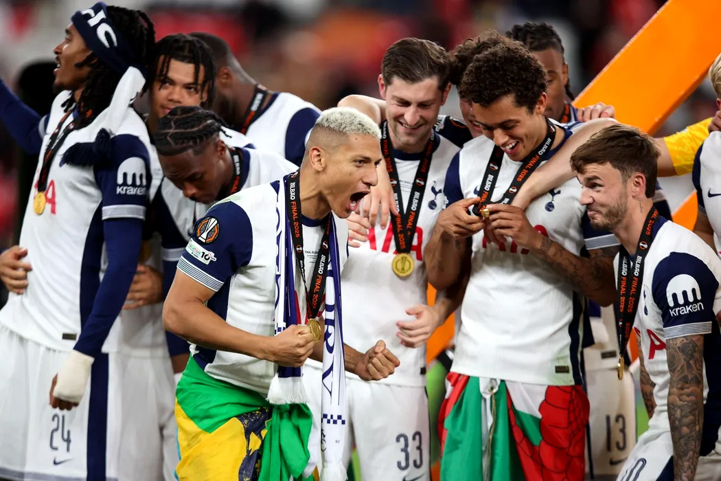 Richarlison de la Tottenham Hotspur sărbătorește cu medalia sa de câștigător după finala UEFA Europa League