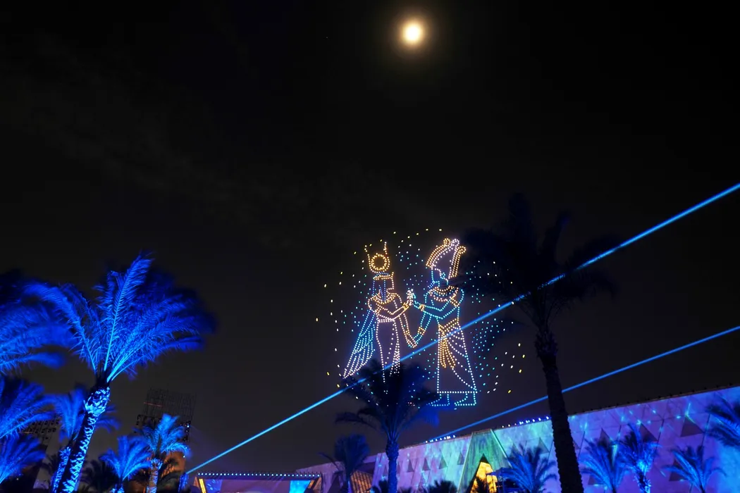 GALERIE FOTO: Antichitatea a întâlnit modernitatea pe cerul din Cairo. Sute de drone au compus chipuri de faraoni, zei­tăți și construcții-simbol ale Egiptului Antic. Un spectacol uriaș de artificii a încheiat ceremonia dedicată inaugurării celui mai mare Muzeu de Arheologie al lumii
