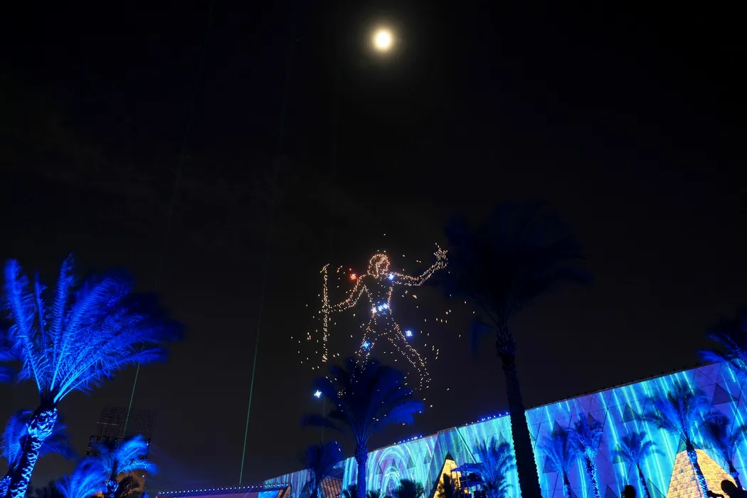 GALERIE FOTO: Antichitatea a întâlnit modernitatea pe cerul din Cairo. Sute de drone au compus chipuri de faraoni, zei­tăți și construcții-simbol ale Egiptului Antic. Un spectacol uriaș de artificii a încheiat ceremonia dedicată inaugurării celui mai mare Muzeu de Arheologie al lumii
