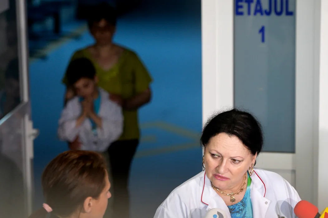 Profesor Doctor Monica Pop face o declaratie de presa in care prezinta cazul unei femei in varsta de 35 de ani din Polovragi, GORJ, si a copilului sau in varsta 8 ani, intepat in ochi cu un cutit. victime ale violentei domestice, la Spitalul Clinic de Urgente Oftalmologice Bucuresti, vineri, 10 aprilie 2015. ANDREEA ALEXANDRU / MEDIAFAX FOTO Utilizare exclusiv editoriala.
