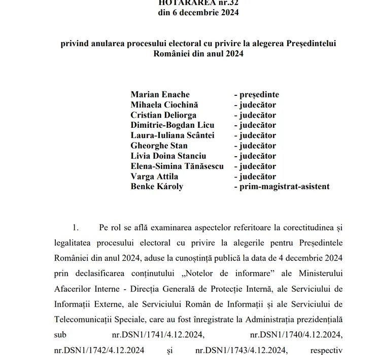 Motivarea deciziei CCR pentru anularea alegerilor prezidențiale: Procesul electoral, „viciat”. DOCUMENT