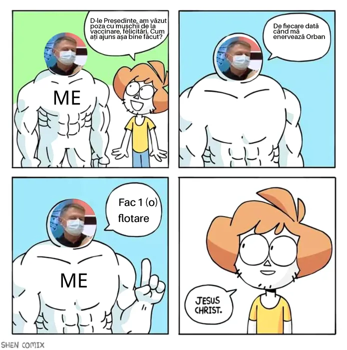GALERIE FOTO: Mușchii lui Klaus Iohannis, vedete pe internet! „La rapel vrem să vedem dacă faceți și abdomene” / „Te bagi 1-1 cu Putin? Cine câștigă primește Basarabia” / Au apărut meme-urile cu momentul vaccinării președintelui – FOTO