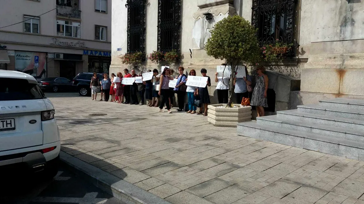 GALERIE FOTO: „Ne vrem școala înapoi”: Profesorii și elevii de la un colegiu din Craiova protestează în fața primăriei – FOTO