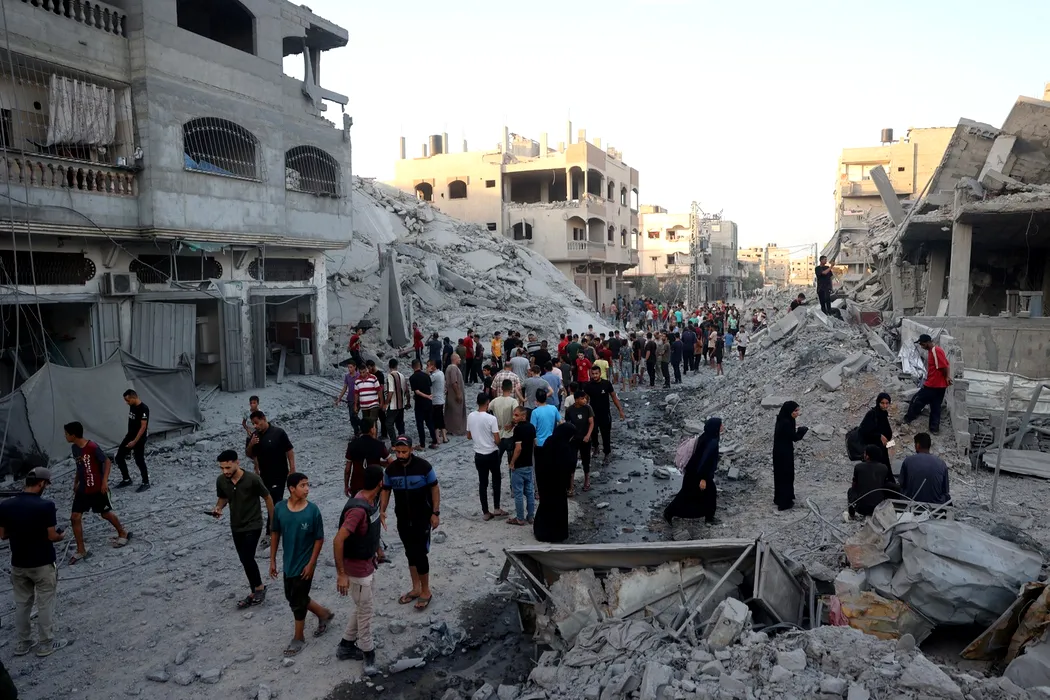Palestinians gather to check a building shortly after it was levelled by Israeli bombing in the Nuseirat refugee camp in the central Gaza Strip on August 22, 2024, as the conflict between Israel and the Hamas militant group continues.,Image: 900765016, License: Rights-managed, Restrictions: , Model Release: no