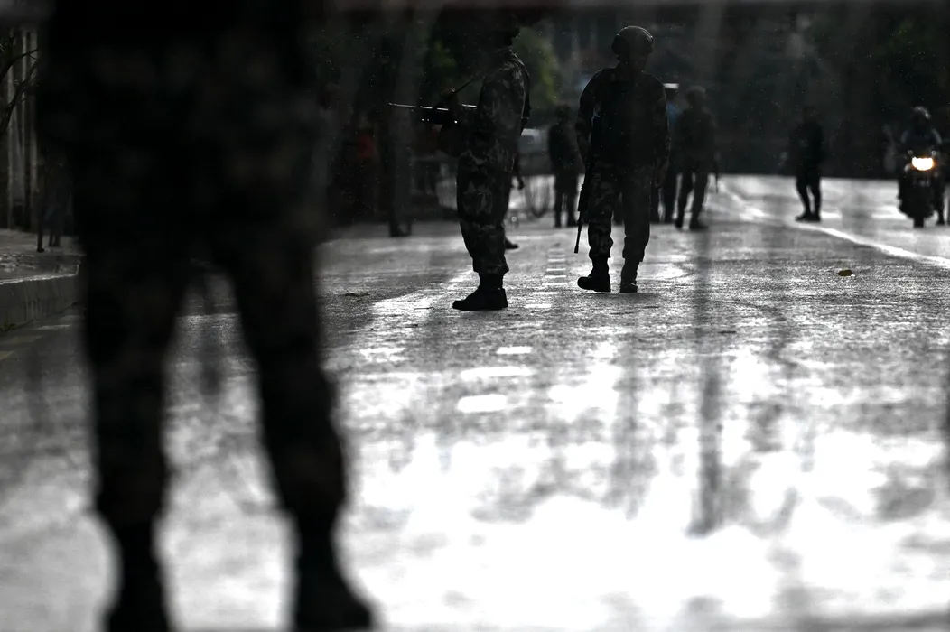 Militari nepalezi stau de pază de-a lungul unei străzi din fața reședinței Președintelui în timpul unei interdicții impuse pentru a restabili legea și ordinea, în Kathmandu.