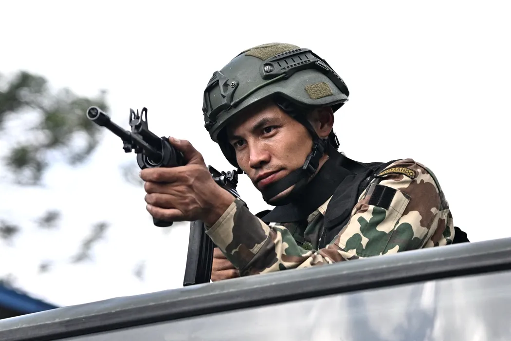 Un militar de pază la biroul prezidențial în timpul unei interdicții impuse pentru a restabili ordinea în Kathmandu pe 12 septembrie 2025.