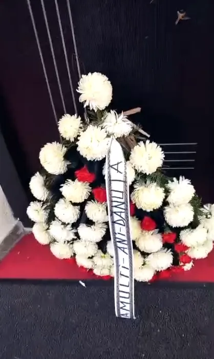 Coroana cu "La mulți ani!", depusă în fața ușii