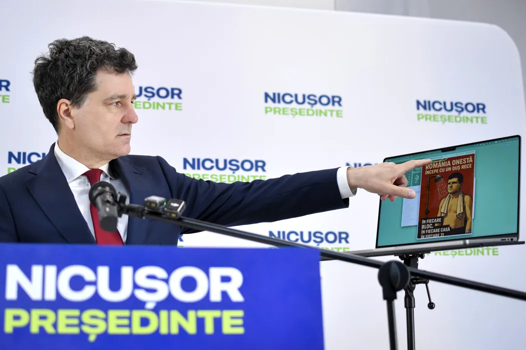 Candidatul independent la alegerile prezidentiale, Nicusor Dan, arata o imagine in care este ironizat, in timpul unei conferinte de presa pe teme politice, la sediul de campanie, in Bucuresti, sambata 12 aprilie 2025. ALEXANDRU DOBRE / MEDIAFAX FOTO.