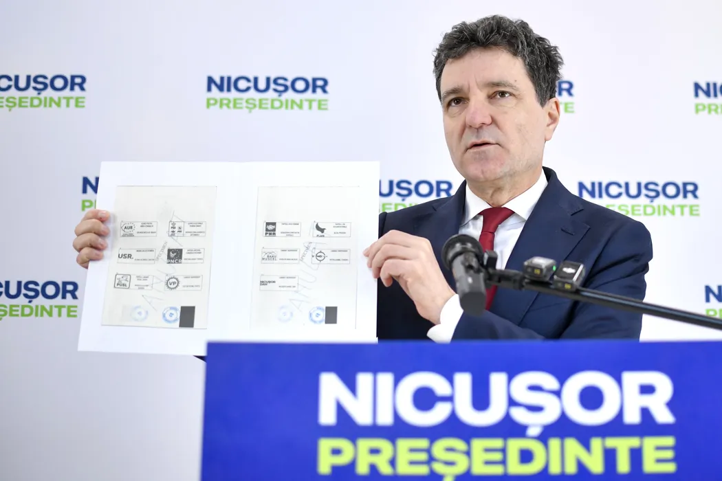 Candidatul independent la alegerile prezidentiale, Nicusor Dan, arata un specimen al buletinului de vot, in timpul unei conferinte de presa pe teme politice, la sediul de campanie, in Bucuresti, sambata 12 aprilie 2025. ALEXANDRU DOBRE / MEDIAFAX FOTO.