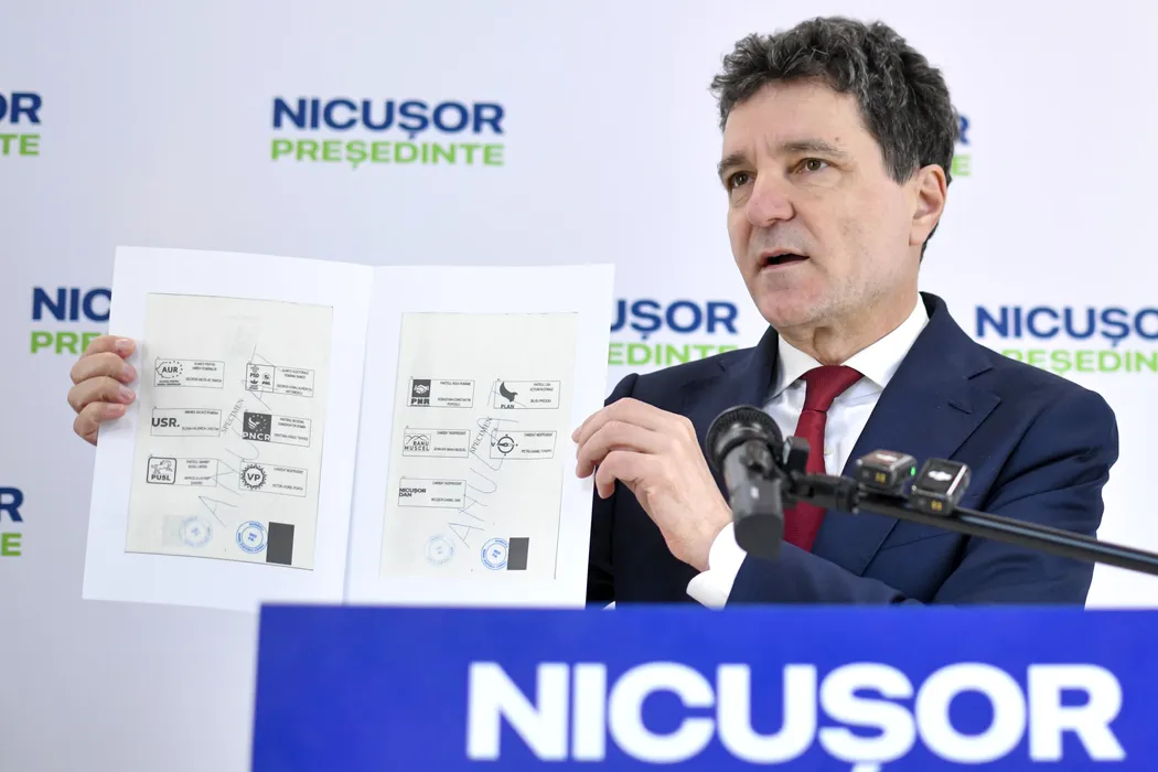 Candidatul independent la alegerile prezidentiale, Nicusor Dan, arata un specimen al buletinului de vot, in timpul unei conferinte de presa pe teme politice, la sediul de campanie, in Bucuresti, sambata 12 aprilie 2025. ALEXANDRU DOBRE / MEDIAFAX FOTO.