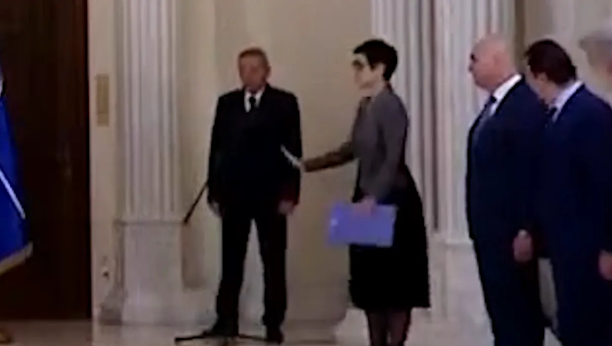 Nicuşor Dan, un NOU moment de derută. De data asta, la ceremonia de învestire a Oanei Gheorghiu. Președintele nu a ştiut unde să se așeze la final. Îi indică şefa protocolului ce are de făcut şi unde să meargă