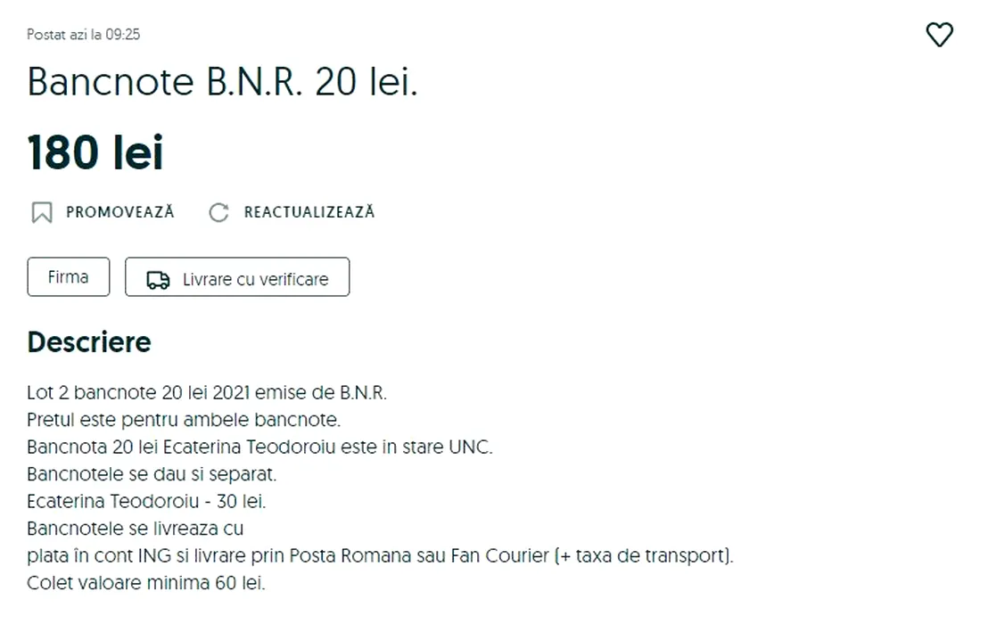 Noile bancnote de 20 de lei, scoase la vânzare pe internet. La ce preț sunt vândute