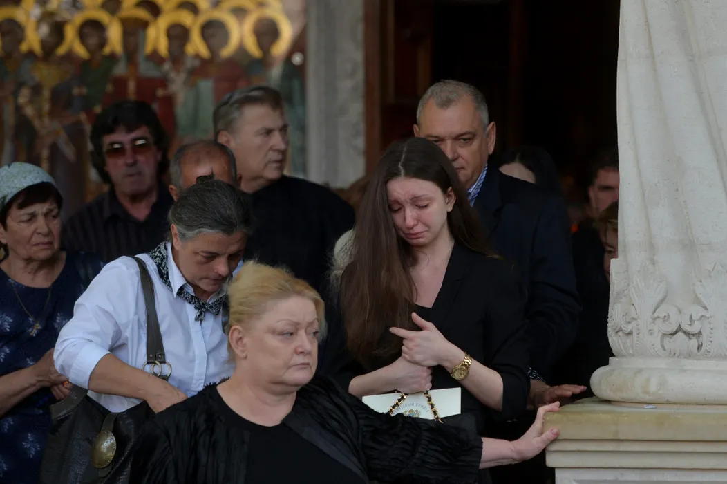 Eugenia, fiica lui Corneliu Vadim Tudor, alaturi de mama sa, Doina, conduce sicriul cu trupul neînsufletit al lui Corneliu Vadim Tudor, care este scos din biserica, in Bucuresti, joi, 17 septembrie 2015. Sicriul a fost scos din Biserica Sfântul Gheorghe Nou dupa o slujba oficiata de 16 preoti, de fata fiind sute de persoane care au aplaudat, si urmeaza sa fie dus la Cimitirul Ghencea Civil, unde va avea loc înmomântarea. Corneliu Vadim Tudor, în vârsta de 65 de ani, a murit, luni, în Centrul Clinic de Urgenta de Boli Cardiovasculare al Armatei. ANDREEA ALEXANDRU / MEDIAFAX FOTO