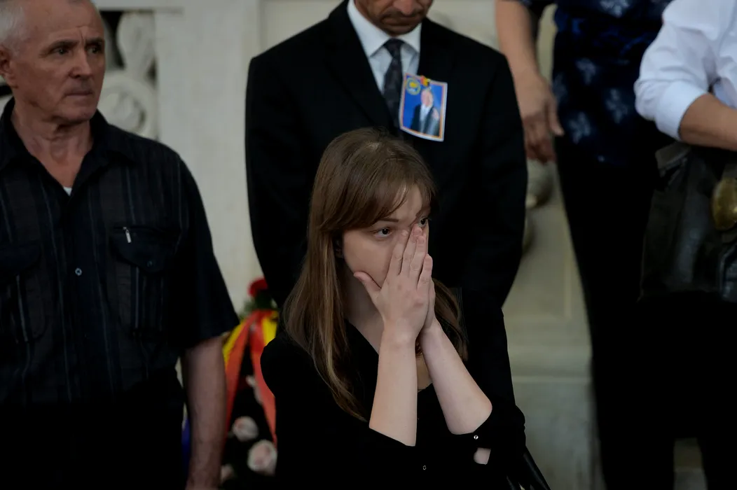 Lidia, fiica lui Corneliu Vadim Tudor, conduce sicriul cu trupul neînsufletit al lui tatalui sau, care este scos din biserica, in Bucuresti, joi, 17 septembrie 2015. Sicriul a fost scos din Biserica Sfântul Gheorghe Nou dupa o slujba oficiata de 16 preoti, de fata fiind sute de persoane care au aplaudat, si urmeaza sa fie dus la Cimitirul Ghencea Civil, unde va avea loc înmomântarea. Corneliu Vadim Tudor, în vârsta de 65 de ani, a murit, luni, în Centrul Clinic de Urgenta de Boli Cardiovasculare al Armatei. ANDREEA ALEXANDRU / MEDIAFAX FOTO