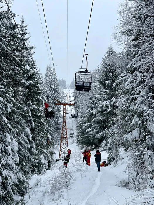 FOTO-VIDEO | Nouă persoane, între care un copil, au rămas blocate în telescaunul din Vatra Dornei. Jandarmii și salvamontiștii din Suceava au intervenit de urgență