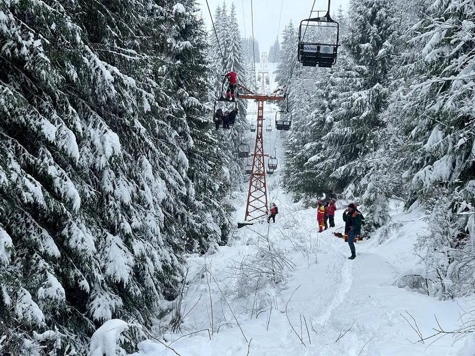 FOTO-VIDEO | Nouă persoane, între care un copil, au rămas blocate în telescaunul din Vatra Dornei. Jandarmii și salvamontiștii din Suceava au intervenit de urgență