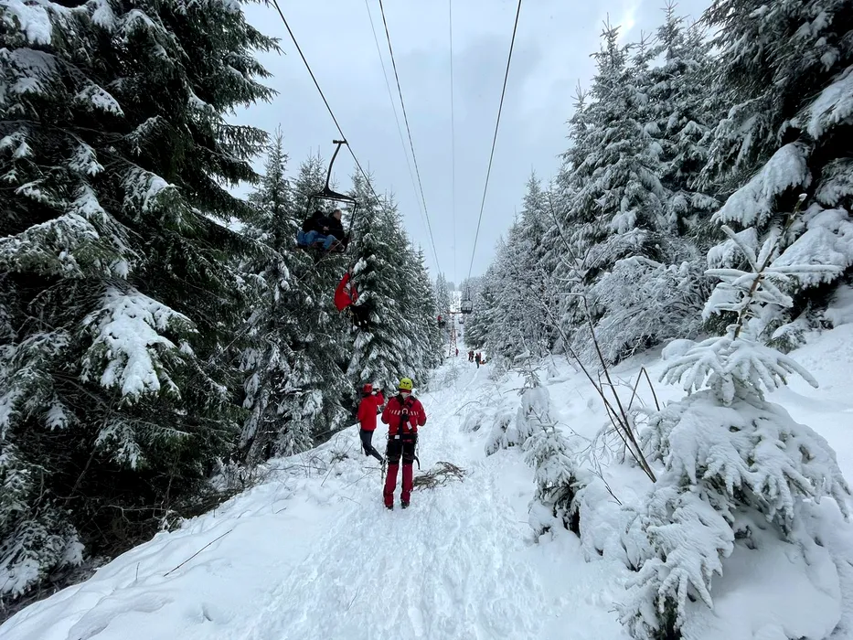 FOTO-VIDEO | Nouă persoane, între care un copil, au rămas blocate în telescaunul din Vatra Dornei. Jandarmii și salvamontiștii din Suceava au intervenit de urgență