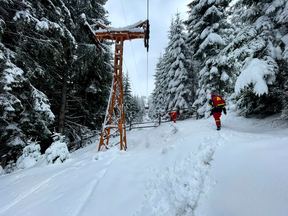 FOTO-VIDEO | Nouă persoane, între care un copil, au rămas blocate în telescaunul din Vatra Dornei. Jandarmii și salvamontiștii din Suceava au intervenit de urgență