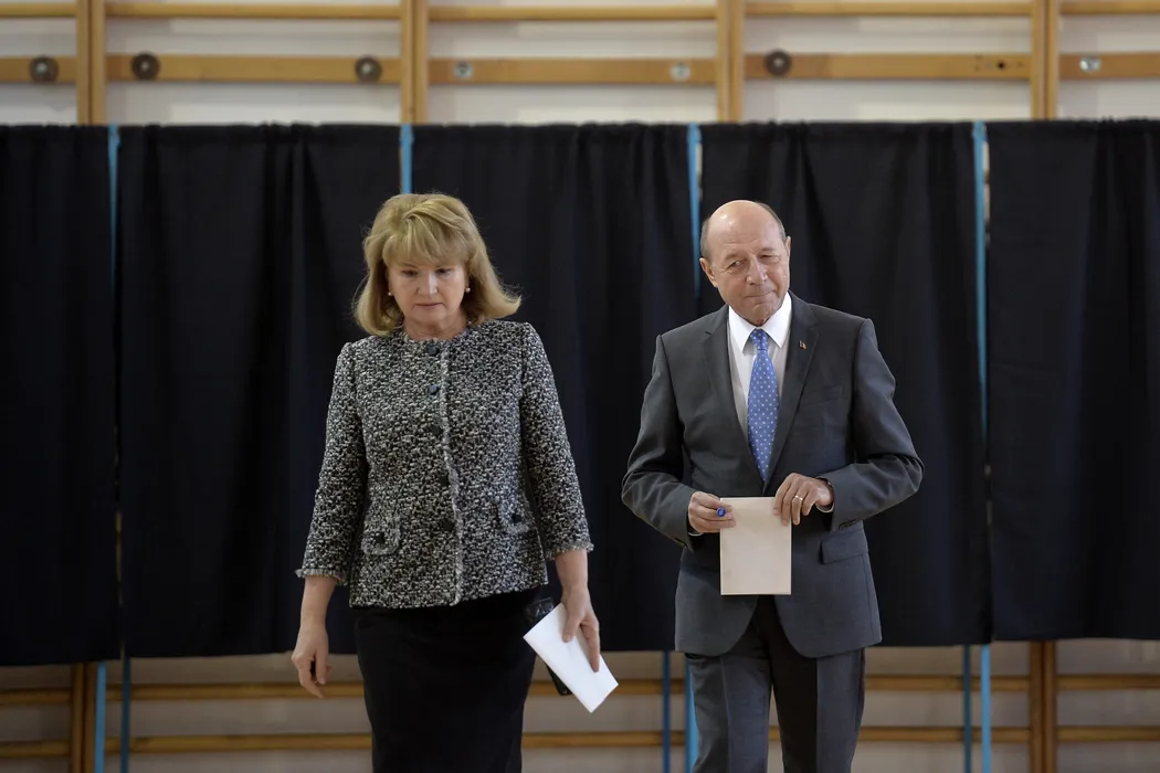 Senatorul Traian Basescu (D), presedinte de onoare al PMP, impreuna cu sotia sa, Maria Basescu(S), voteaza la referendumul pentru redefiniriea familiei sambata, 6 octombrie 2018, la sectia de votare nr. 64 din incinta Liceului Jean Monnet din Bucuresti. ALEXANDRU DOBRE / MEDIAFAX FOTO