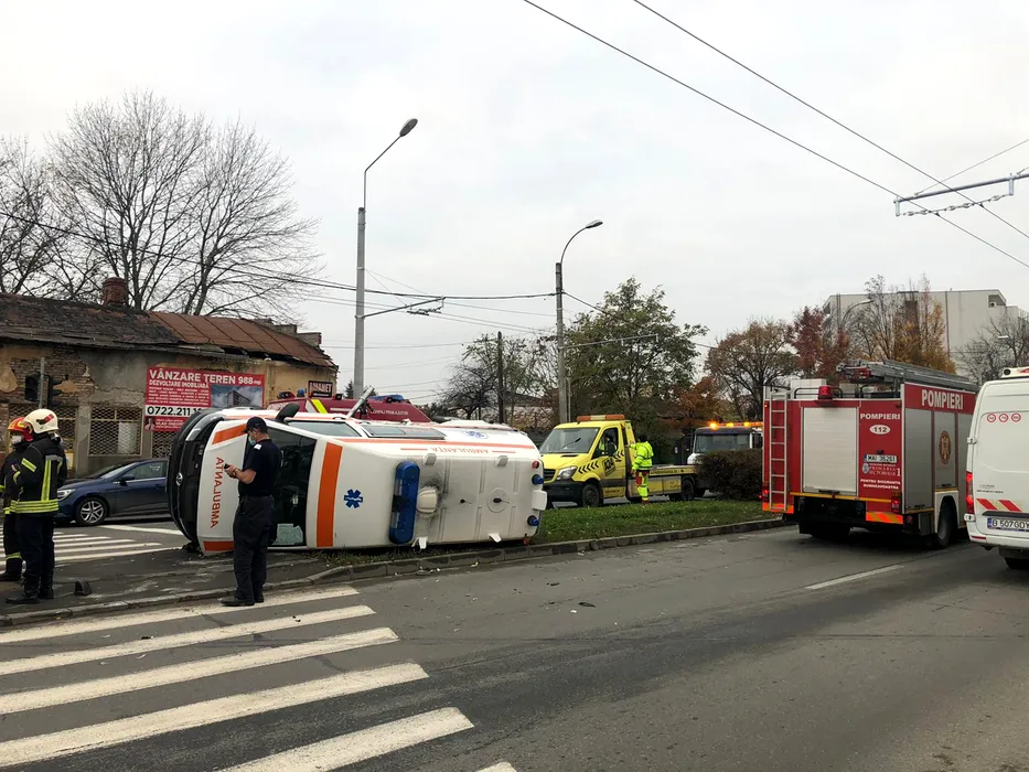 GÂNDUL LIVE. O ambulanță din Capitală a fost lovită atât de tare de un BMW încât a fost răsturnată! IMAGINI ULUITOARE!