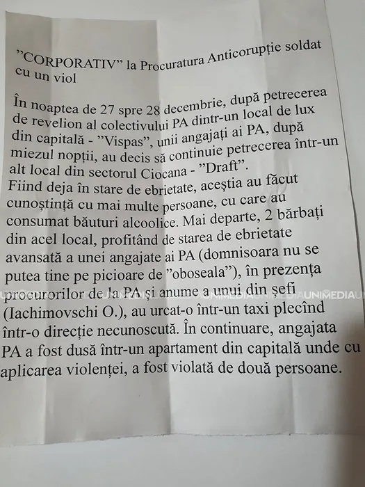 O angajată de la Procuratura Anticorupție din Republica Moldova acuză că a fost victima unui viol, după o petrecere corporativă
