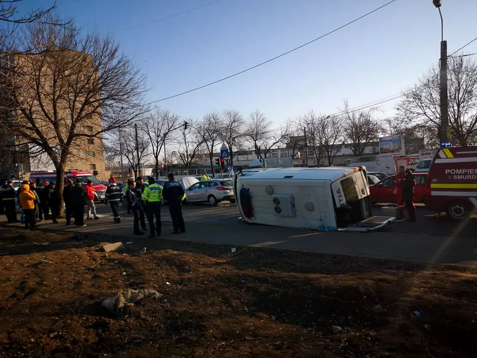 O autospecială a Poliției s-a răsturnat în Capitală după ce a fost lovită de o altă mașină. Polițista a fost transportată la spital – FOTO