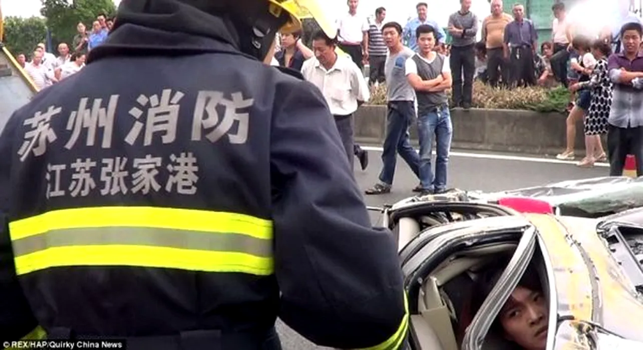 O chinezoaică a supraviețuit miraculos după ce un container s-a prăbușit peste mașina ei