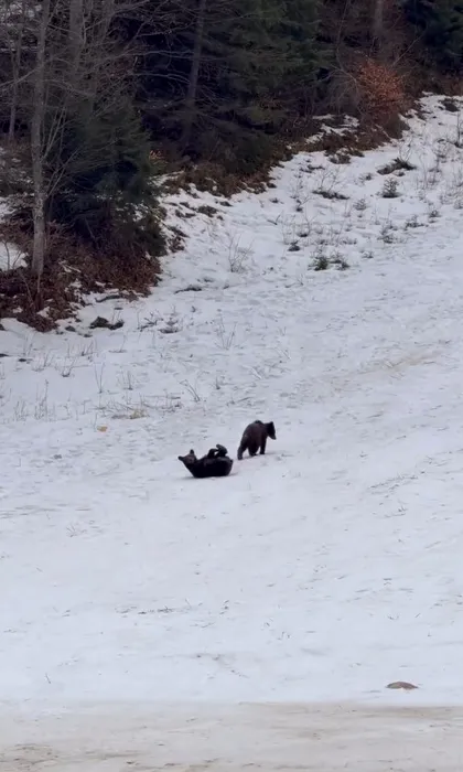 O familie de urși i-a luat prin surprindere pe schiorii din Poiana Brașov. Cei trei frați blănoși s-au jucat nestingheriți pe pârtie și au alunecat pe zăpadă