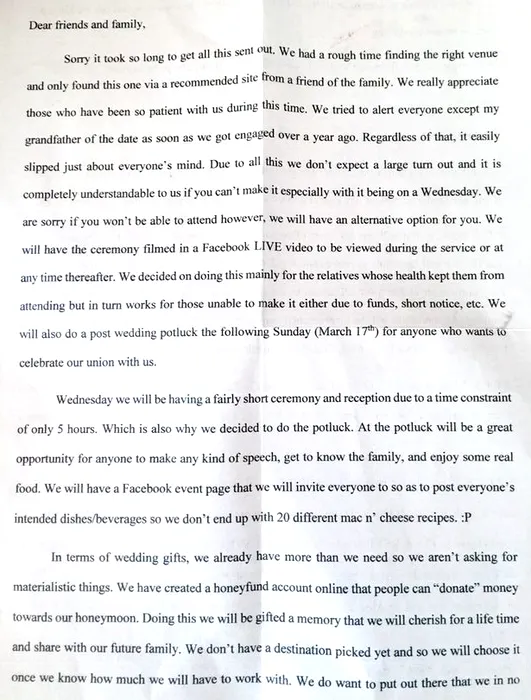 O invitație la nuntă „altfel” stârnește controverse în mediul online: „Simt că am nevoie de o invitație la nunta asta după ce mi-a luat atât să citesc scrisoarea” – FOTO