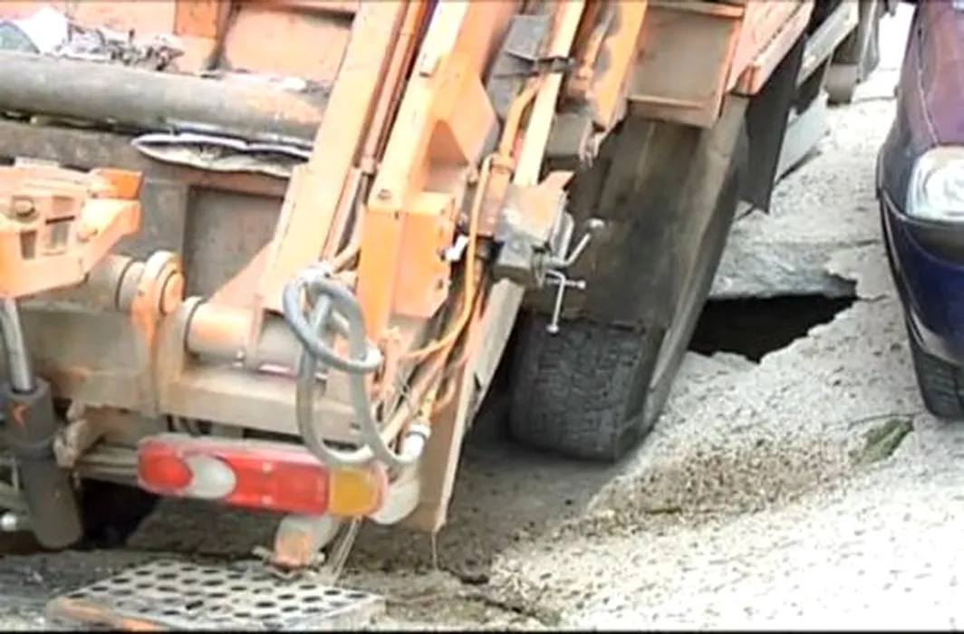 O mașină de gunoi a căzut într-o groapă de patru metri pătrați, după ce s-a surpat asfaltul. FOTO
