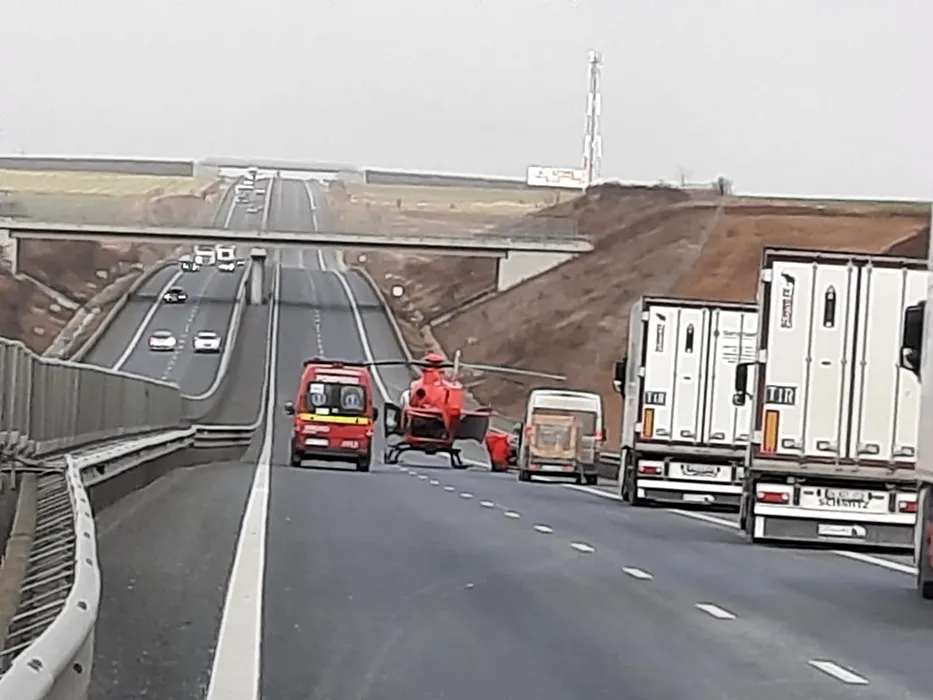 Accident pe A1, soldat cu trei răniți. O mașină oprită pe banda de urgență, după ce i s-a făcut rău unui pasager, a fost lovită de un TIR