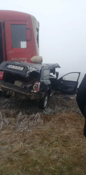 O persoană a murit, iar alta e grav rănită, după ce mașina în care se aflau a fost lovită de un tren în Arad FOTO