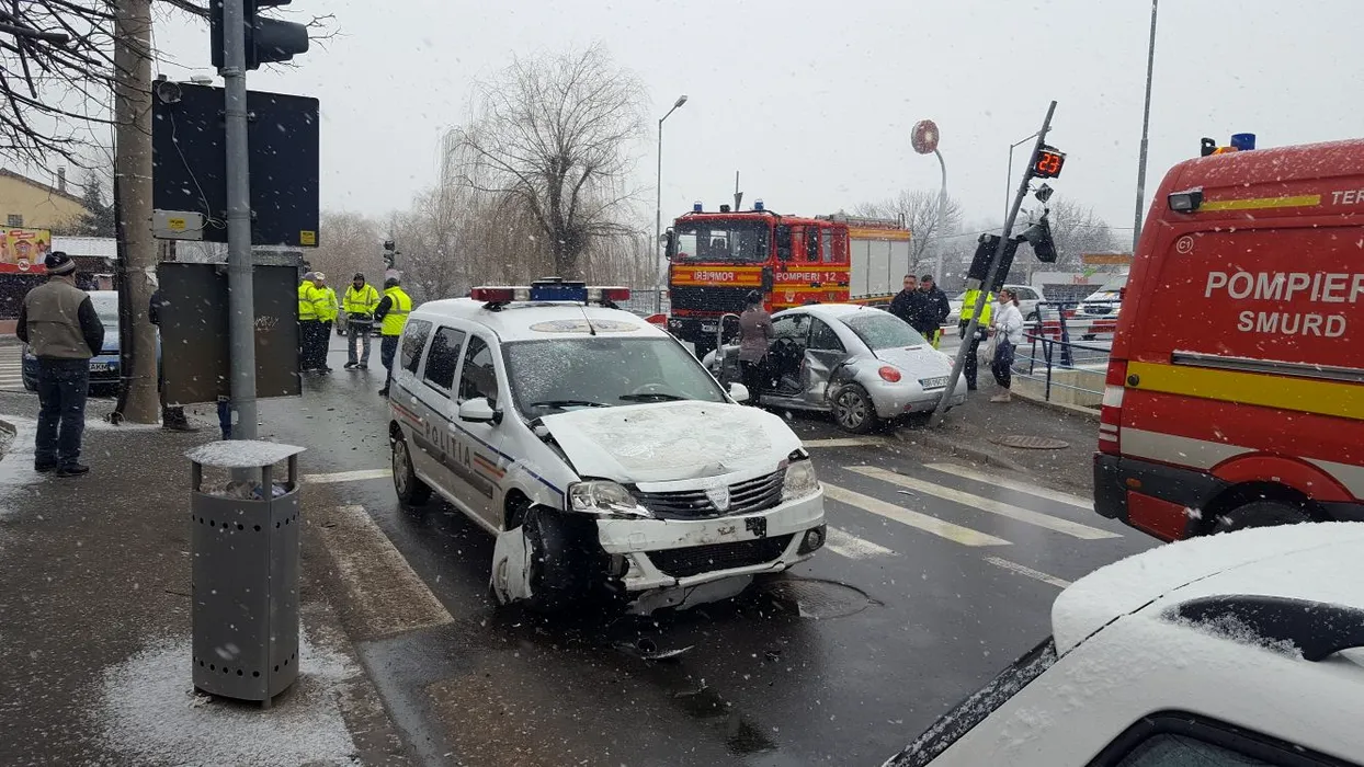 O șoferiță de 63 de ani din Sibiu, rănită, după ce a trecut pe roșu și a fost lovită în plin de mașina poliției. FOTO