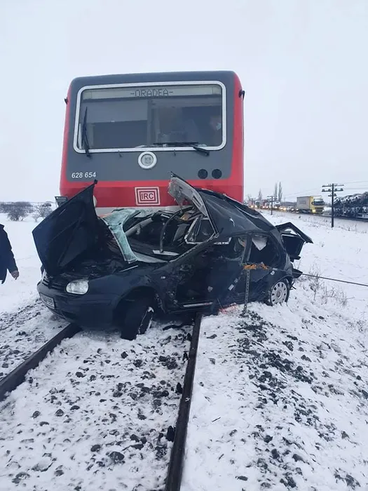 FOTO-VIDEO | O tânără de 22 ani a murit după ce mașina pe care o conducea a fost lovită de tren, în județul Arad
