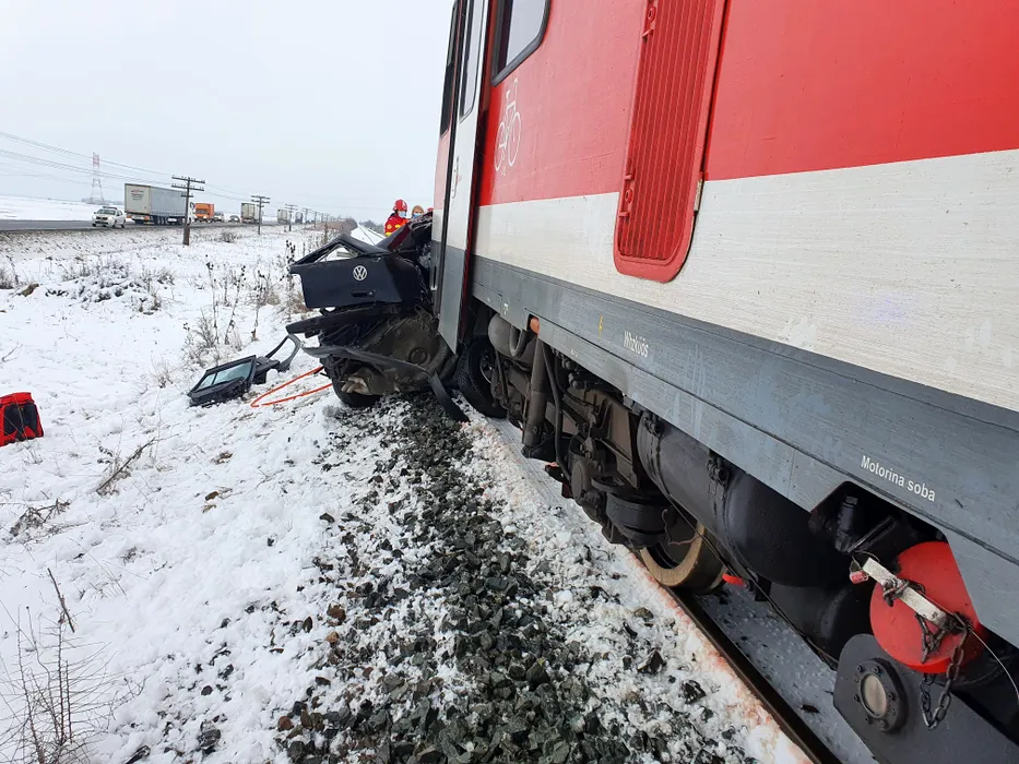 FOTO-VIDEO | O tânără de 22 ani a murit după ce mașina pe care o conducea a fost lovită de tren, în județul Arad