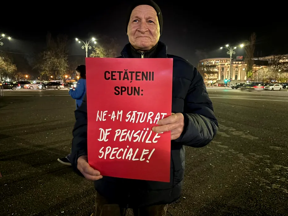 Oamenii strigă în Piața Victoriei împotriva pensiilor speciale: „Ei cu speciala, noi cu cheltuiala”