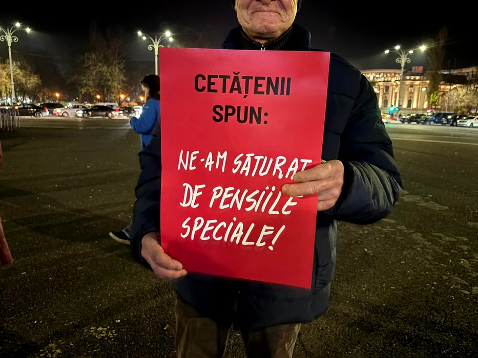 Oamenii strigă în Piața Victoriei împotriva pensiilor speciale: „Ei cu speciala, noi cu cheltuiala”