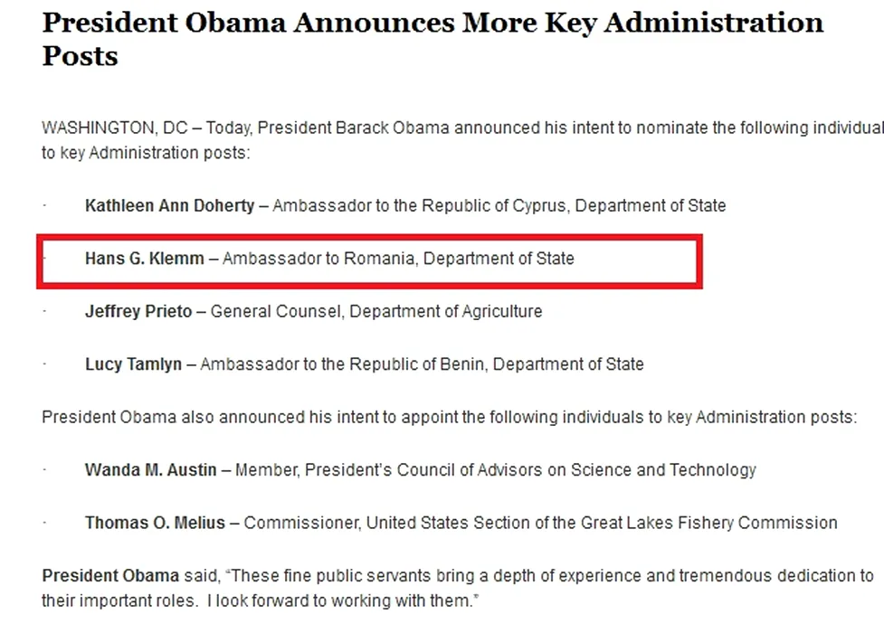 Obama a nominalizat un ambasador pentru România. Cine este Hans G. Klemm
