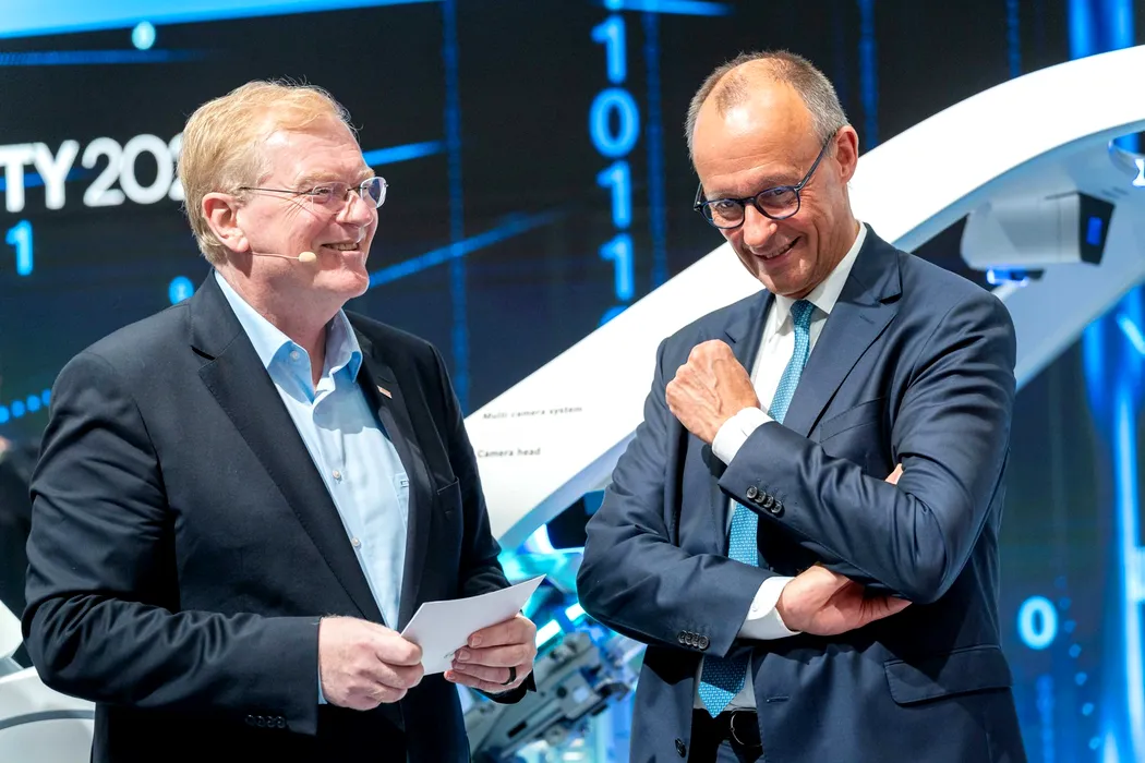 Munich, Bavaria, Germany - September 9, 2025: : IAA Mobility 2025 trade fair in Munich. Tour of the trade fair, Friedrich Merz CDU party / Federal Chancellor talks to Dr.-Ing. Stefan Hartung Chairman of the Board of Management of Robert Bosch GmbH at the Bosch stand *** IAA Mobility 2025 Messe in München. Messerundgang, Friedrich Merz Partei CDU / Bundeskanzler bzw. Kanzler unterhält sich am Messestand von Bosch mit Dr.-Ing. Stefan Hartung Vorsitzender der Geschäftsführung der Robert Bosch GmbH,Image: 1035571335, License: Rights-managed, Restrictions: imago is entitled to issue a simple usage license at the time of provision. Personality and trademark rights as well as copyright laws regarding art-works shown must be observed. Commercial use at your own risk., Model Release: no