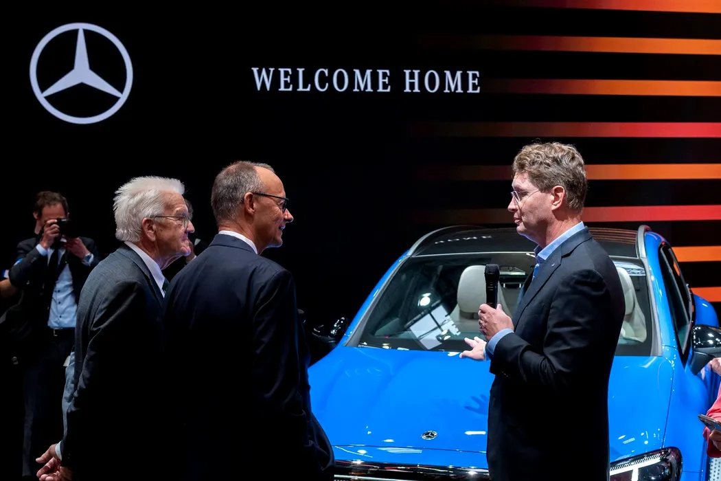 Munich, Bavaria, Germany - September 9, 2025: IAA Mobility 2025 trade fair in Munich. Tour of the trade fair, Winfried Kretschmann Bündnis 90 - Die Grünen party / Minister President - Baden-Württemberg, Friedrich Merz CDU party / Federal Chancellor at the Mercedes Benz stand with Ola Källenius Chairman of the Board of Management of Mercedes-Benz Group AG *** IAA Mobility 2025 Messe in München. Messerundgang, Winfried Kretschmann Partei Bündnis 90 - Die Grünen / Ministerpräsident Baden-Württemberg, Friedrich Merz Partei CDU / Bundeskanzler bzw. Kanzler am Messestand von Mercedes Benz mit Ola Källenius Vorsitzender des Vorstands der Mercedes-Benz Group AG,Image: 1035580235, License: Rights-managed, Restrictions: imago is entitled to issue a simple usage license at the time of provision. Personality and trademark rights as well as copyright laws regarding art-works shown must be observed. Commercial use at your own risk., Model Release: no