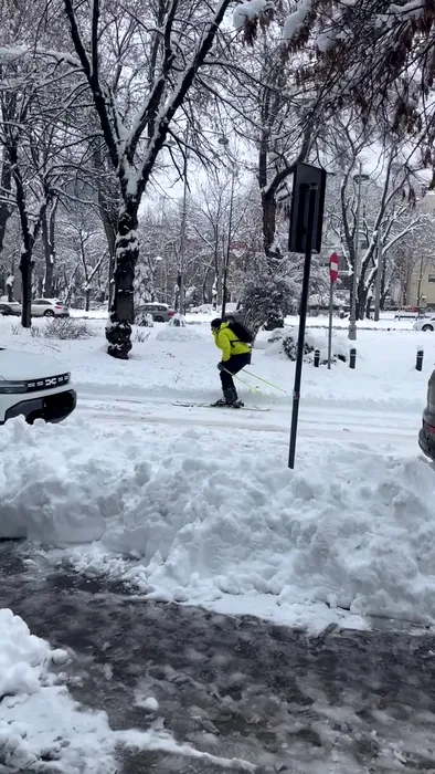 „Olimpiada bucureșteană”. Un bărbat a fost surprins pe schiuri, pe străzile din București, în ziua în care traficul a paralizat în urma ninsorii