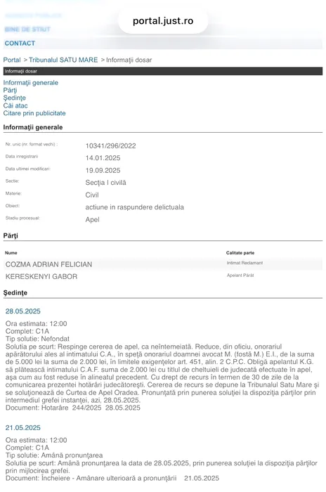 Onoare de deputat, reparată de instanţă cu daune de 10.000 lei. Primarul din Satu Mare a pierdut procesul cu liberalul Adrian Cozma