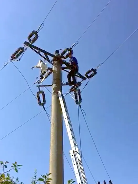 Operațiunea „Barza”, în Dâmbovița. Cum au intervenit pompierii pentru salvarea unei păsări prinse în firele electrice / GALERIE FOTO