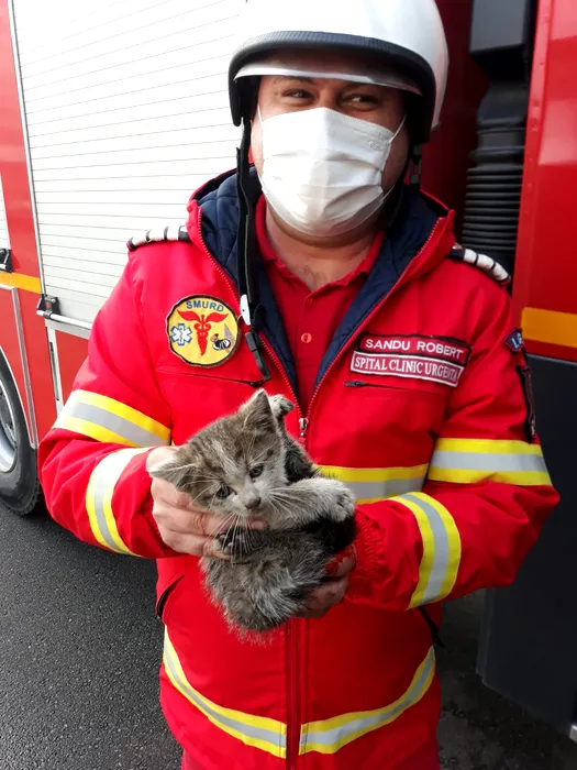 „Operațiunea pisoiul”. Pompierii au intervenit pentru salvarea unui motănel prins sub un tramvai! IMAGINI EMOȚIONANTE