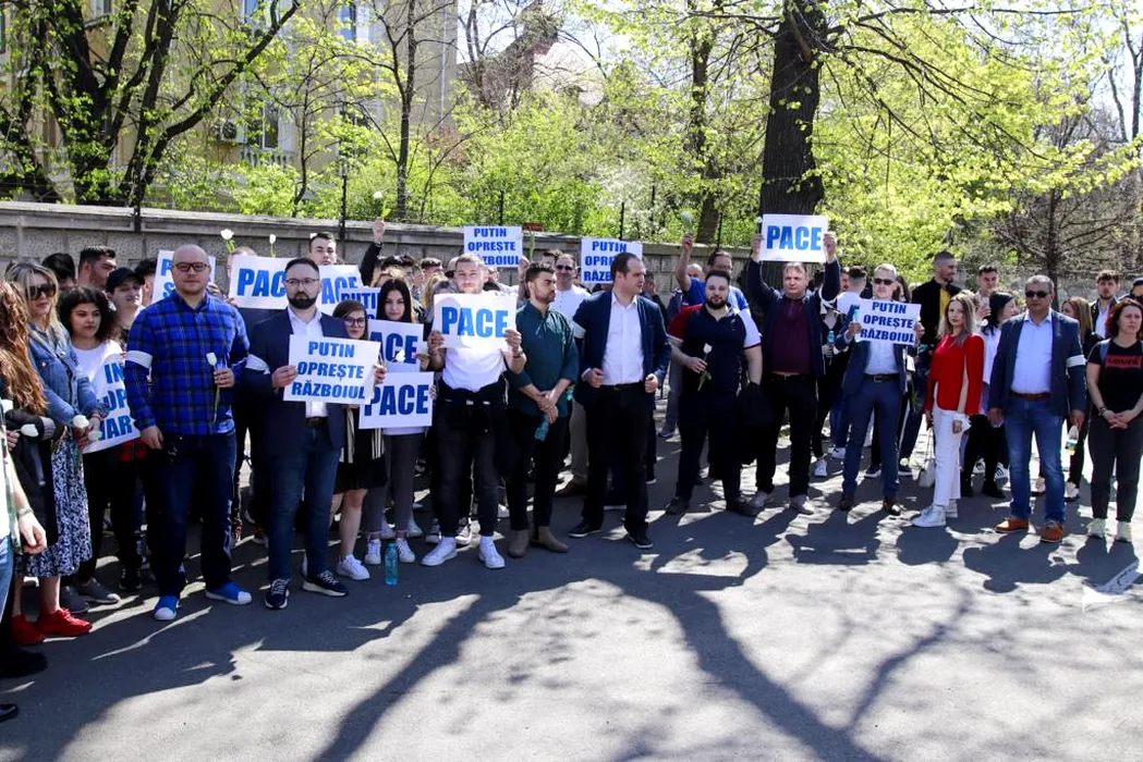 FOTO | Organizația de Tineret a PMP, protest în fața Ambasadei Federației Ruse din București. „Masacrele din ultimele săptămâni trebuie să înceteze”
